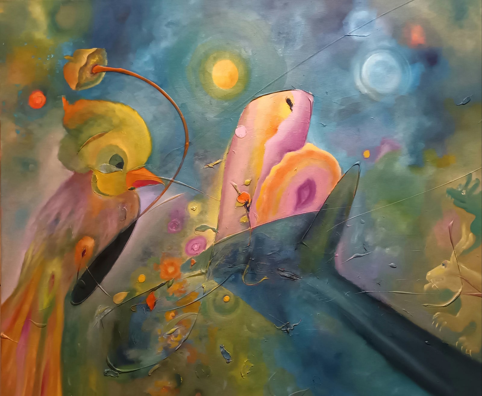 Złota rybka w krainie szczęśliwości Akryl na płótnie, 100×120 cm, 2024